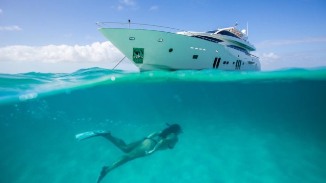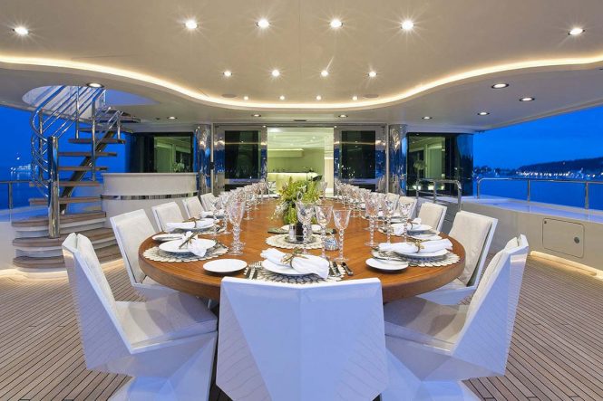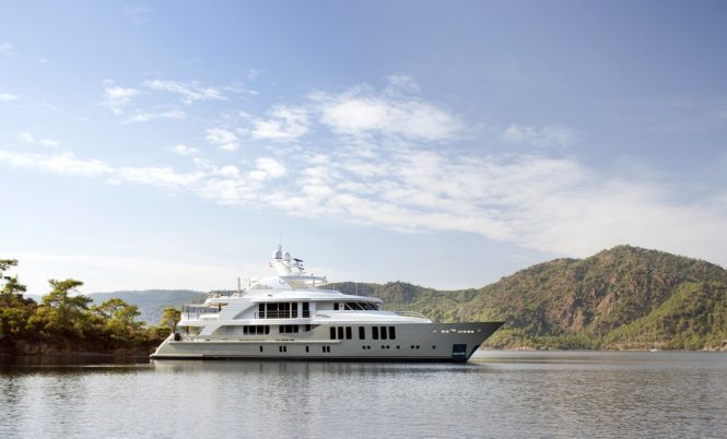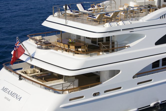 Italian shipyard Benetti is known for their quality and showmanship, and M/Y MEAMINA is no exception: The 12 guests on board in six stately en-suite cabins also have at their disposal a generous sundeck Jacuzzi and a gym just inside, a skylounge with a piano for live entertainment, and a cinema setup in the main salon. There’s also a large selection of water toys such as Scuba diving equipment and Seabobs to keep guests busy for hours on end, and since MEAMINA is an Approved RYA Water Sports Centre, guests can earn a jet ski licence while they’re having fun.