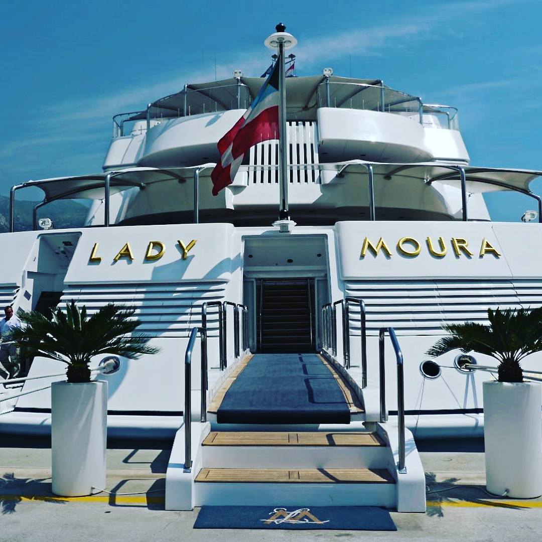 Please contact CharterWorld - the luxury yacht charter specialist - for more on superyacht news item "Lady Moura showing off her gold platted name plate".