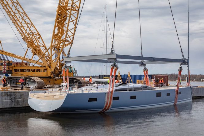 Sailing yacht LIARA has hit the water at Baltic Yachts in Finland. This 34.14m/112ft all-carbon sloop with a beam of 7.9m/25.11ft belongs to the Baltic 112 series with naval architecture by Malcolm McKeon Yacht Design. Designed for an experienced owner, LIARA is a fast cruising yacht equipped for regattas and the most important yacht racing events. Her interior with accommodation for eight guests was developed by Adam Lay Studio.