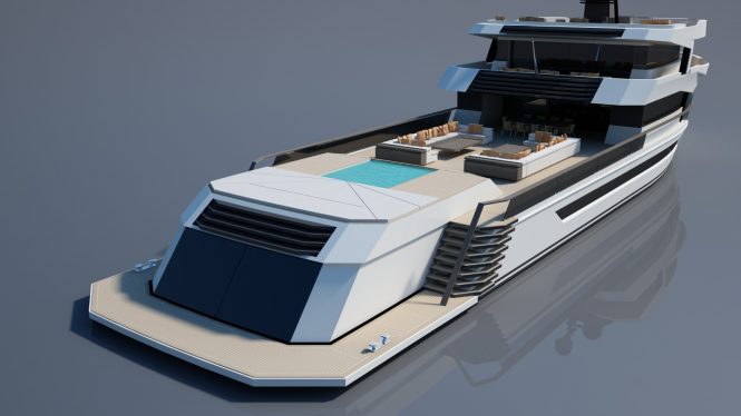 Unusual for the yacht of her size, the bathing platform is spacious and is accessible through the staircase, which also has a rather unique design. Tender and toys can be stored at the large tailgate, which can alternatively serve as a gymnasium, depending on owner’s preferences. Guests can enjoy the large infinity pool and relax in the spacious sunbathing area aft. When covered, this area can be used as a helicopter deck. From the bridge deck, a large umbrella slides out to cover the vast “C” facing lounge areas to hide from the sun or rain. The side falcon is made of structural tempered glass which provides shelter and allows to admire panoramic views.