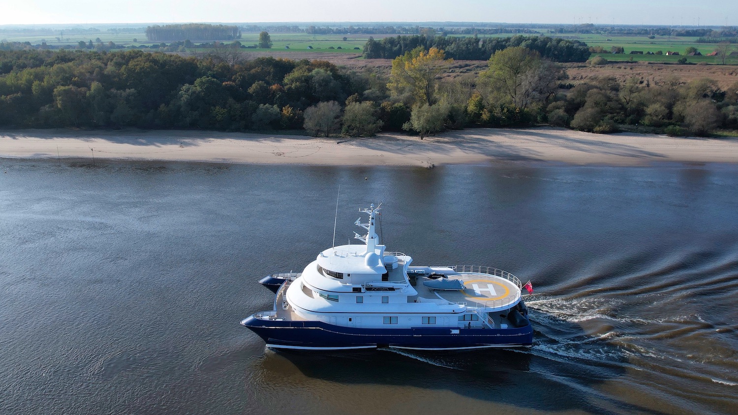 This image is featured as part of the article 41m Catamaran Yacht NURJA spotted heading to Abeking & Rasmussen shipyard.