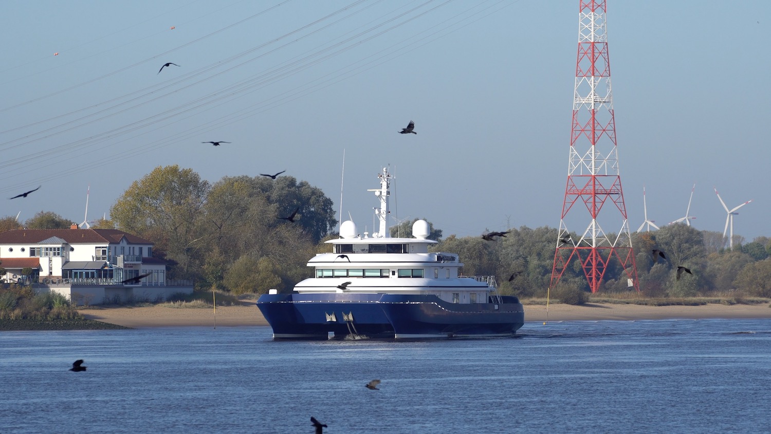 This image is featured as part of the article 41m Catamaran Yacht NURJA spotted heading to Abeking & Rasmussen shipyard.