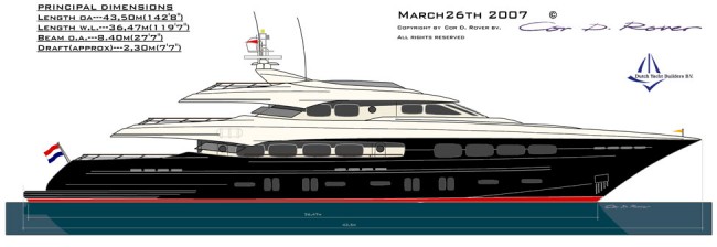 M/Y Latitude was built by Dutch Yacht Builders in aluminium to a Cor D Rover design. Cor D. Rover is a Dutch design studio specialised in styling of large motor yachts. Dutch Yacht Builder has sinse being under new ownership in 2003 changed path from smaller yacht construction to larger custom and semi custom sailing and motor yachts.