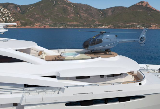 Accommodation layout comprises an 80 sqm master suite, a VIP suite, two double and two twin cabins. A total of 12 guests can stay overnight, while a crew of 12 will take care of everything onboard.