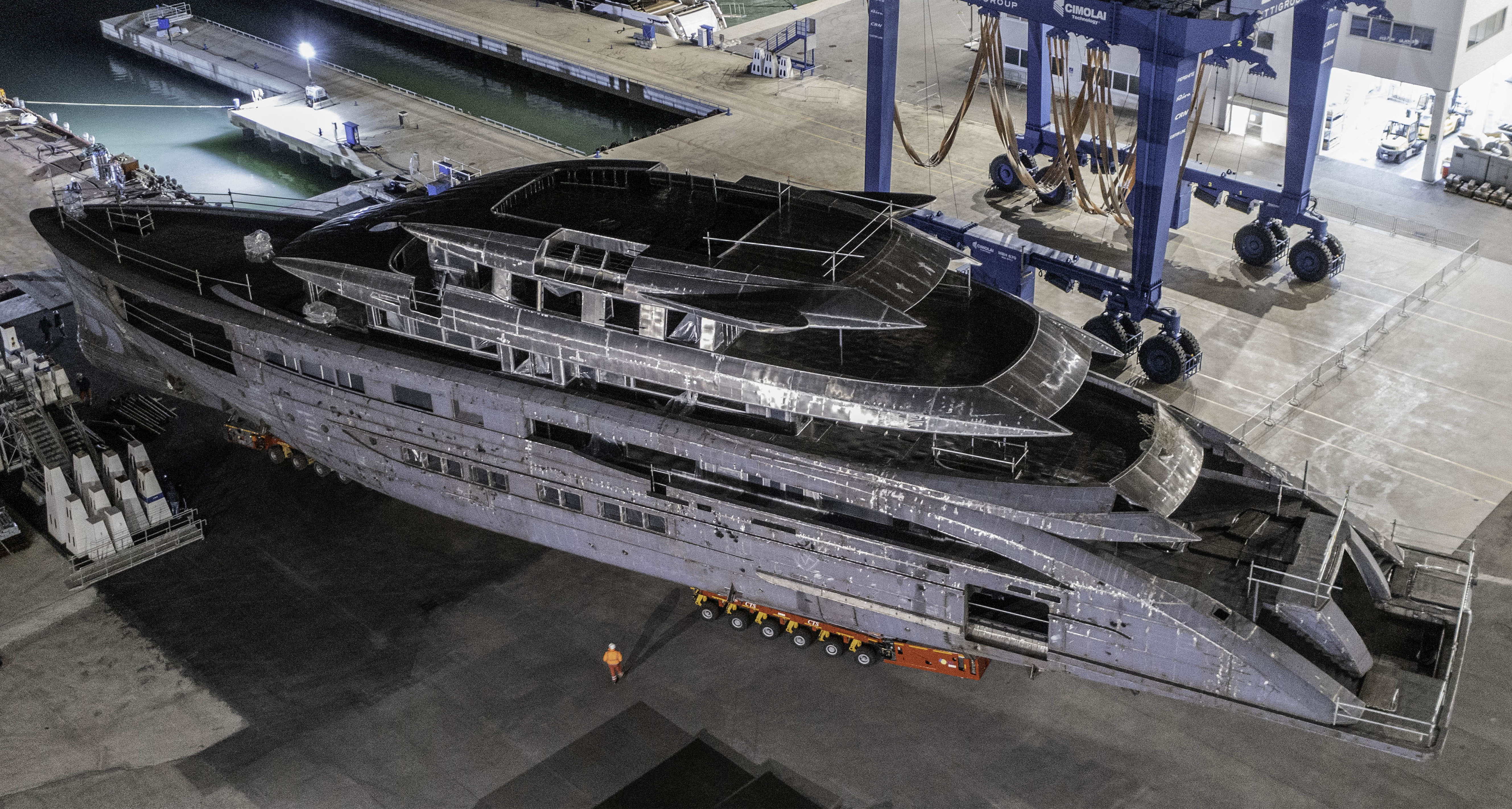 This image is featured as part of the article 67m mega yacht CRN143 PROJECT MARANELLO – hull has been relocated as she continues to take shape.