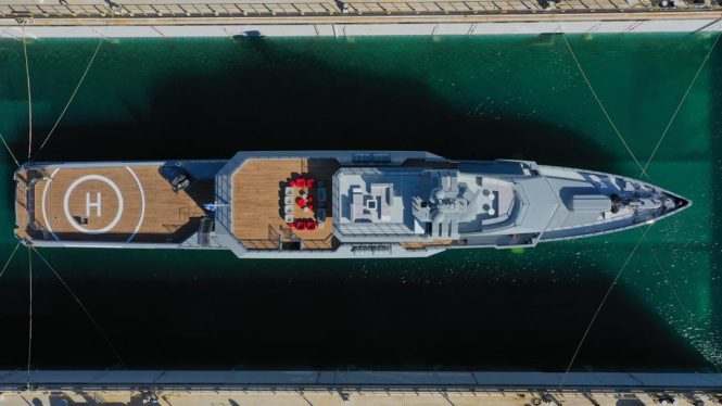 The top view shot illustrates the helicopter deck aft and a massive exterior outdoor lounge area on the upper deck aft. The 12-ton crane on the aft deck provides easy launching of tenders and toys.