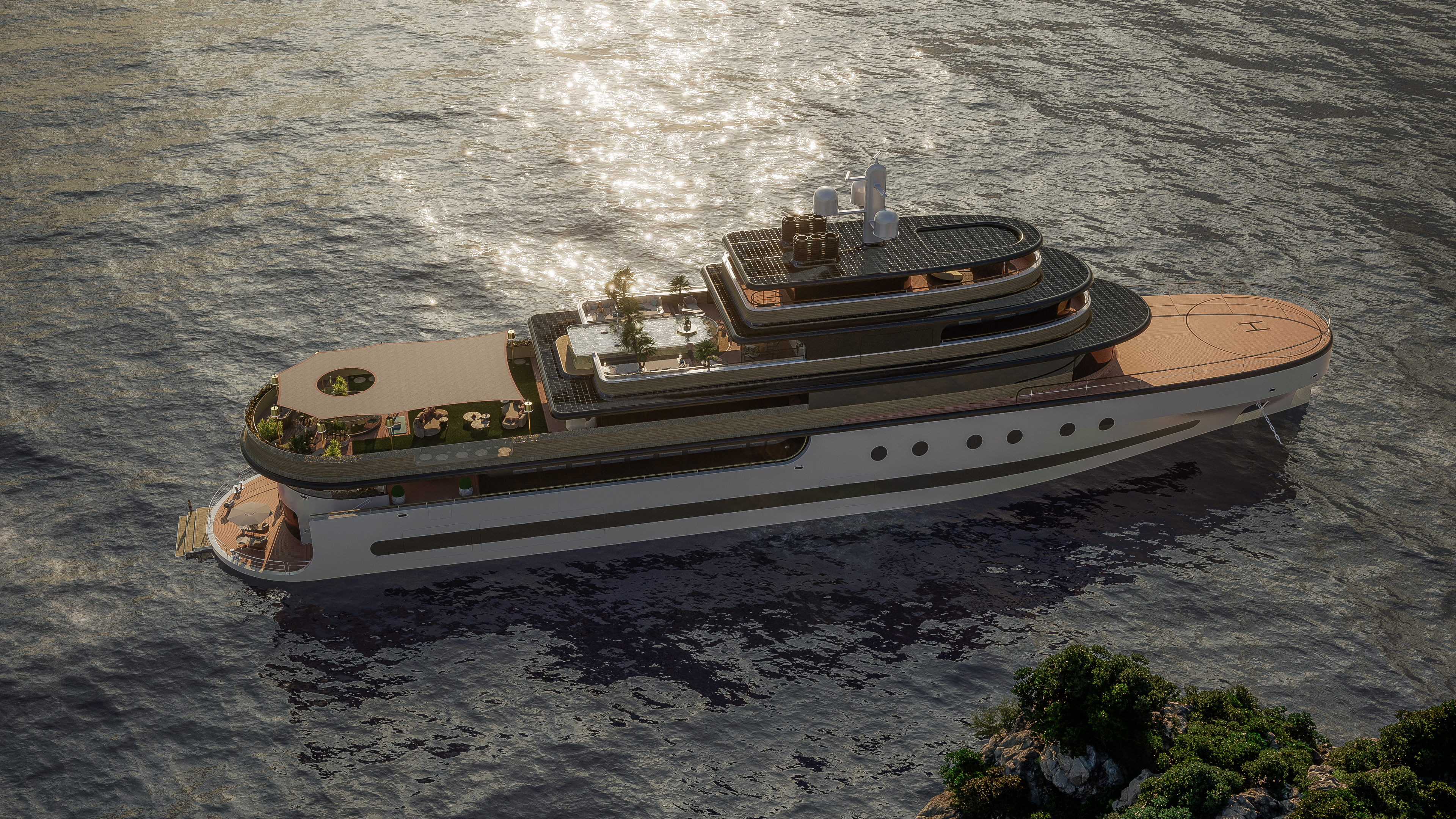 This image is featured as part of the article 85m nature-led superyacht design SYMBIOSIS to be unveiled at 2023 Monaco Yacht Show by Studio KMJ.