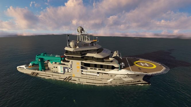 The helipad forward is equipped with a hangar for up to three submersibles, while the upper deck is equipped with a 40-ton crane and a 40-ton A-frame for loading shipping containers.
