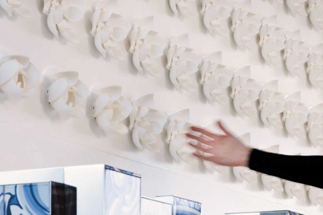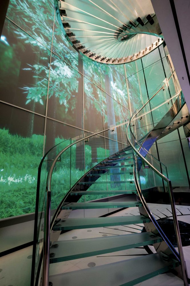 Art has been brought to life through technology onboard M/Y LUMINOSITY: There are over 370m/1213ft of interactive panels showing nature scenes in motion as guests walk through corridors and up the glass and steel spiral staircase. The 264 white magnolia flowers on the main salon wall create a moving mural, opening and closing as someone passes by.