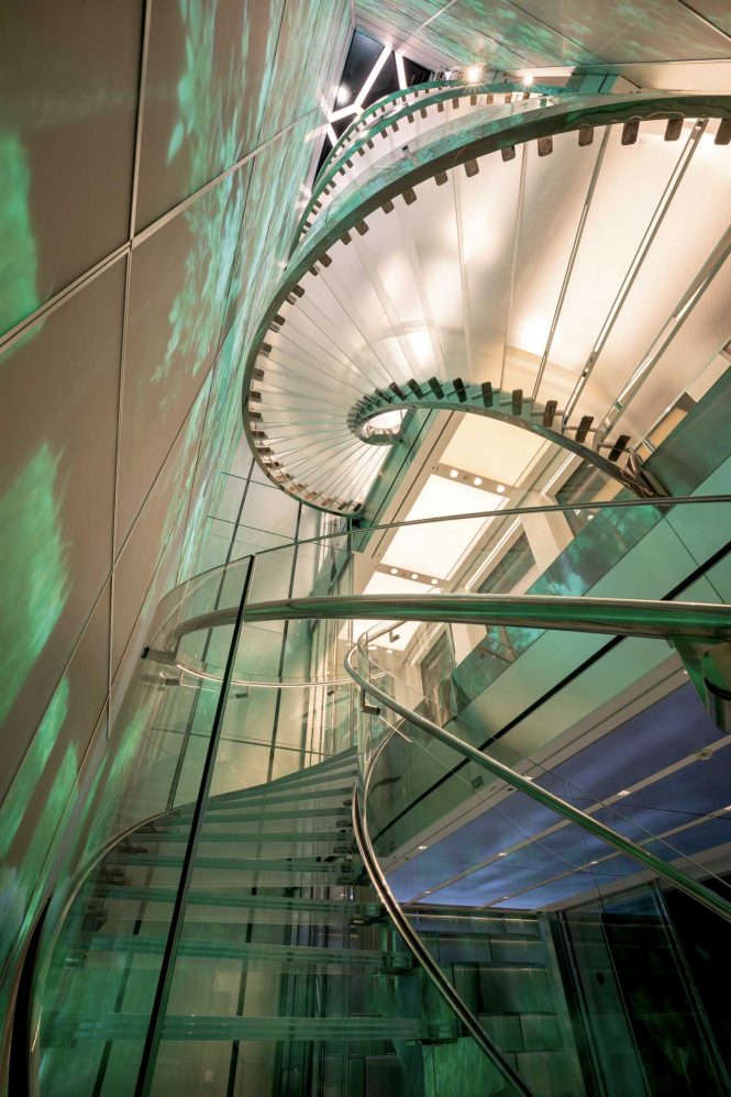 As alluring as the exteriors are, it’s the interiors that steal the show: Designed by Zaniz Interiors, there are homages throughout to celebrated artists and creatives, such as the Damien Hirst-inspired circles on the French limestone floor in the main deck foyer, and the ‘stairwell eye’ nods to Man Ray. The geometric style of Matisse’s later collage work is used in the sky lounge and salon, creating a focal point in the marvellous hand-forged steel lighting fixture that has been polished to a mirror finish and encloses a thousand Bohemian crystal bulbs within. The beginning of Moby Dick is engraved into the pillars, and Portuguese Majolica tiles can be seen on the cabinetry from Boca do Lobo.