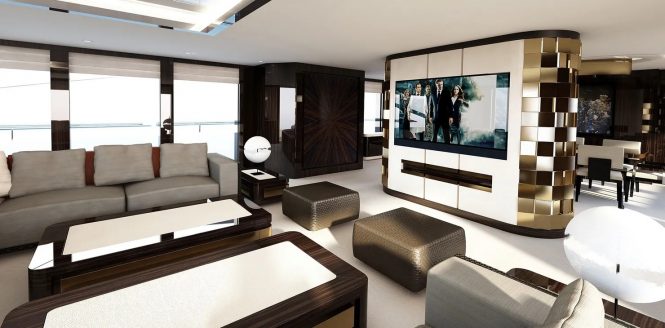The U-shaped windows in her sophisticated exterior profile, along with dynamic curves and extensive glazing, make her stand out from the crowd. The interiors were created by Focus Yachts Design, who penned the bright spaces with opulent textures and cream color palette.