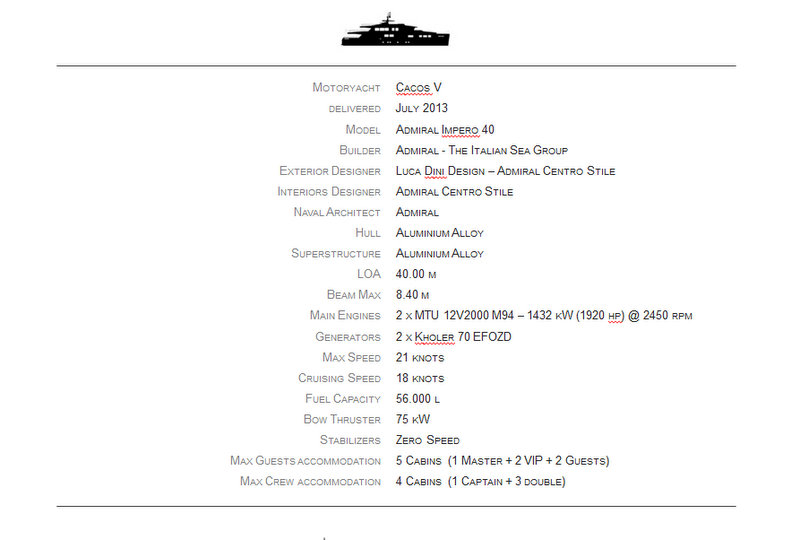 Please contact CharterWorld - the luxury yacht charter specialist - for more on superyacht news item "Technical Specifications of Cacos V superyacht".