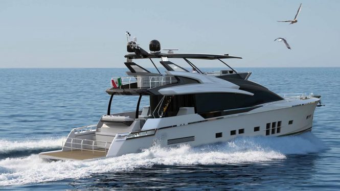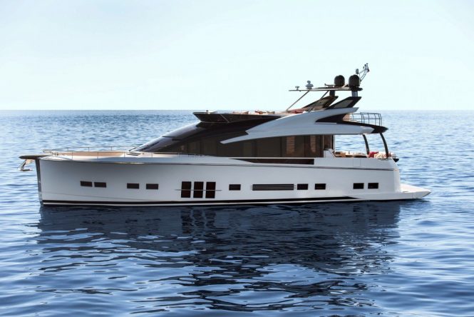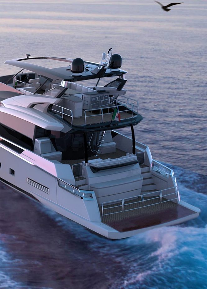 Adler has announced its intention to expand its range of carbon fibre hybrid hulls with a new 25m/83ft flagship; the Adler Suprema XL. Built on speculation, the RINA-class fast planing luxury yacht will feature the interior and exterior styling of Nuvolari Lenard, with accommodation up to 8 guests over 4 en-suite cabins, which include a full-beam master suite, a VIP stateroom and two convertible twin cabins. The crew cabins sleeps up to 2 and is accessible via a cockpit.