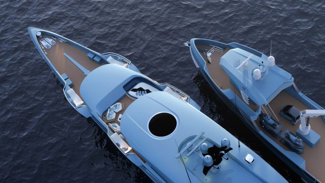 The 36m/118ft shadow vessel for the 55m/180ft luxury yacht PROJECT PHI from Royal Huisman has been sold and will be used for the transportation of tenders and water toys plus a land-based vehicle and additional fuel for the mothership.