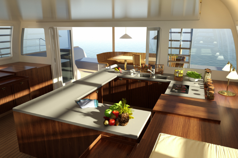 Real “loft” on the water, the spacious saloon, with its large sliding doors opens widely to the outside. The interior is light and airy; it is well ventilated thanks to the large opening windows. A spacious and friendly galley looks onto the saloon and the outside. With the generous worktop and simple and uncluttered design, the galley is functional and very pleasant. Outside, there are large living areas with deckchairs and a long table where 12 guests can enjoy a friendly meal.