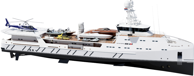Due for delivery in Spring 2012, the SEA AXE 6711 Support Vessel is being customised according to the requirements of the client, the owner of a large luxury superyacht. For example the deck will be fitted with a helipad fully certified to M.C.A. LY2 (large yacht code), capable of supporting a large helicopter with maximum take-off weight of 5000kg.