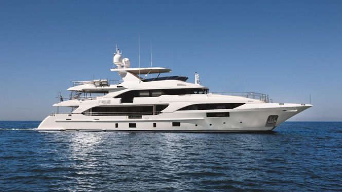 The 29-metre Delfino 95 motor yacht BAYA was designed by Giorgio M Cassetta with interior styling by Benetti’s in-house team. The yacht’s spaces boast opulent marble, shiny brass inserts and ash, eucalyptus and tay wood. The indoor areas are brightly lit with natural light through the abundance of glazing in the exterior design. M/Y BAYA is fitted with two 1,000hp MAN V8 engines and reach a top speed of 14.5 knots. At her cruising speed of 10 knots, she has a range of 2,400nm.