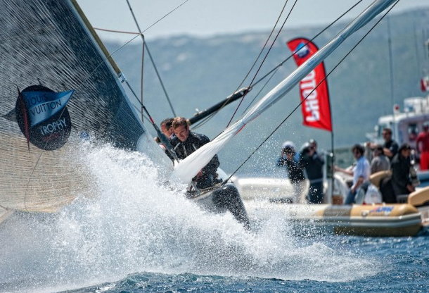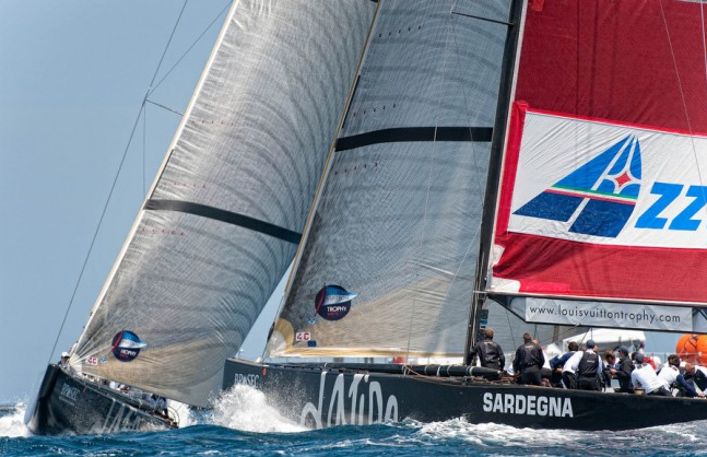 Flight Nineteen, Race One: Azzurra def. TEAMORIGIN , 01:03 – Great Britain’s Ben Ainslie took TEAMORIGIN aross the line first at the favored pin end, bow forward by 18 metres . Francesco Bruni in Azzurra gradually gained and tacked just to leeward of the British boat on the port layline as Ainslie called for water, close to the shoreline. From there Bruni gradually squeezed up on Ainslie for a 14 second lead at the top mark and extended from there.