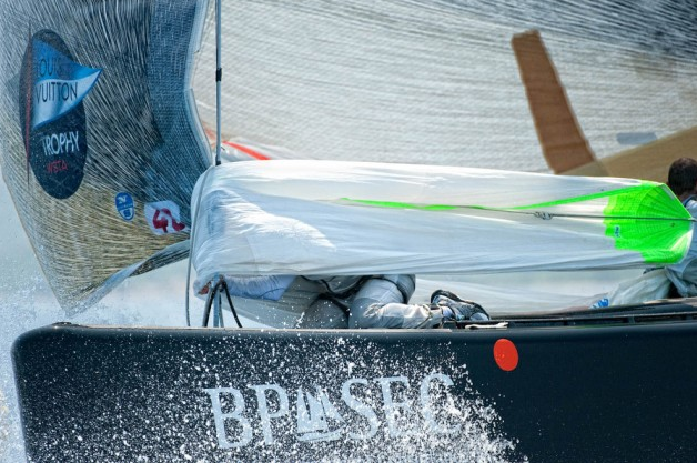 Flight Twenty, Race One: Mascalzone Latino def. ALEPH Sailing Team, 00:01 – Gavin Brady steering Mascalzone Latino snatched victory by one second from France’s ALEPH in the closing metres of an intense chase by the Italian boat. Bertrand Pacé dominated a split tack start and led by 18 metres as he started ten seconds after the gun. Brady kept it close through four legs. There was seldom more than one boat length between them. The Italians closed on ALEPH when the French boat botched the last gybe for the mark and conceded their lead.