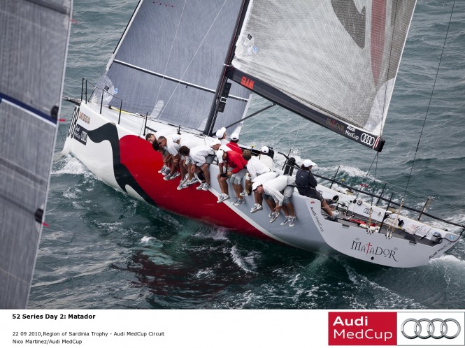 Matador won the first race which was contested in near perfect sea breeze conditions of nine to ten knots. Quantum Racing lead through the early stages of the race but chose to gybe set at the final windward mark while Vasco Vascotto and Francesco Bruni conspired to go right down the run to gain more than half a minute, stealing across the finish ahead of the 2008 Audi MedCup champions.