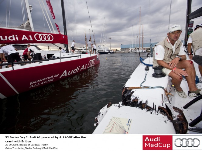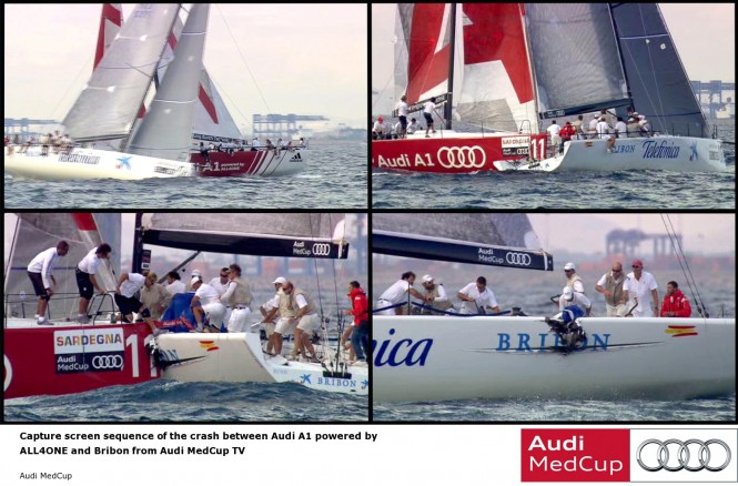 With dark clouds covering the race area and an oppressive, humid air replacing the early sunshine, the final race of the day was marred by a first beat collision between Audi A1 powered by All4ONE and Bribon. The Franco-German team lost control in the final, painful seconds as the tried to duck the Spanish boat and struck them hard one third of the way from the back of their port topsides. Both boats had to retire and Bribon will not be able to take any further part in the regatta.