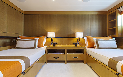 The second AMELS 199 MADAME KATE bears a stylish interior design by Laura Sessa. She can sleep up to 12 guests in utmost in luxury, looked after by a crew of 15. The full-beam master stateroom provides breath-taking views from generous circular windows. In addition to the three lower deck suites, there are also two full-size VIP guest suites on the bridge deck.