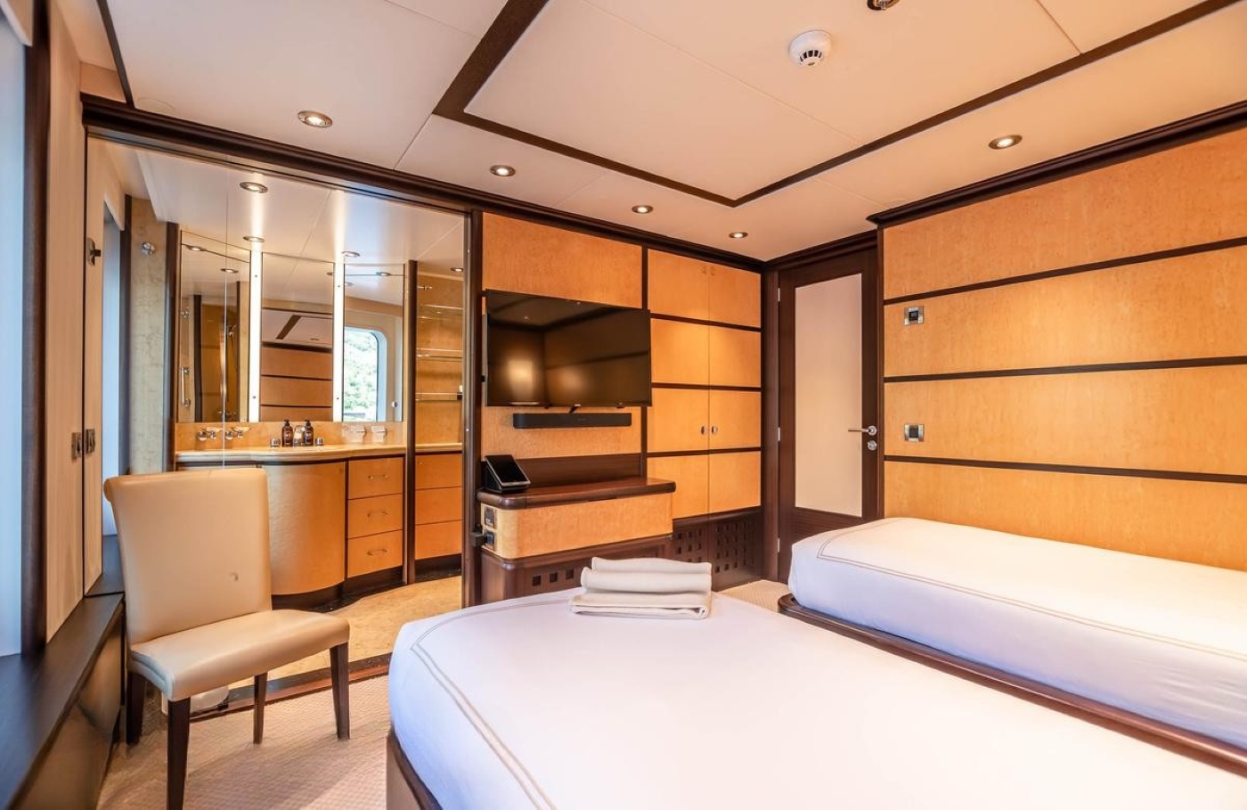 SAVANNAH features an eco-friendly blend of single diesel engine, three gensets, batteries, propeller, azimuting thruster, as well as a streamlined hull shape, offering fuel economies of thirty per cent. Further innovation of this striking vessel comes in the form of a floating superstructure, an underwater lounge, the ‘open’ aft deck areas, and much more besides. Moreover, SAVANNAH boasts an exceptionally high-end tender bay finished in teak with a hatch that doubles as a mooring platform. After docking, guests can walk inside the garage and take the stairs straight up to the main deck.