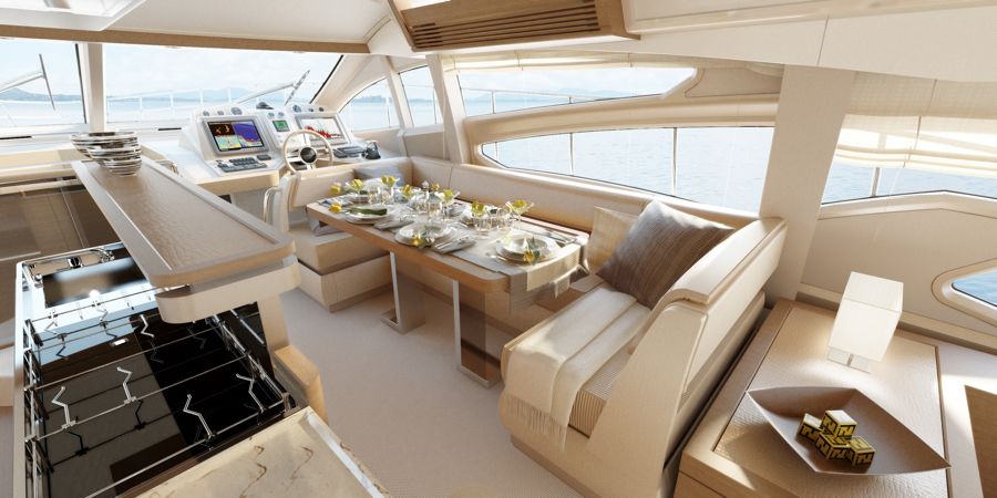 The boat’s maneuverability and seaworthiness have been enhanced as well to make sailing even more pleasurable. The flybridge Azimut 64 line yacht  is equipped with an Easy Docking system and Seakeeper gyrostabilizers that reduce roll by up to 80%, both with the boat at anchor and under way. The helm station features excellent ergonomics, with a double seat and power-assisted back, a height-adjustable steering wheel placed in the middle of the instrument panel to provide full control of the onboard instrumentation, a spacious windscreen and electrically operated side windows for maximum visiblity.