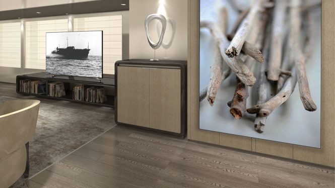 The long-term partner of Baglietto, Margherita Casprini, is responsible for the interiors. The styling creates a modern and relaxing atmosphere with some soft tones of beige and brown in the decor.