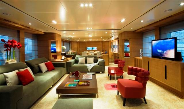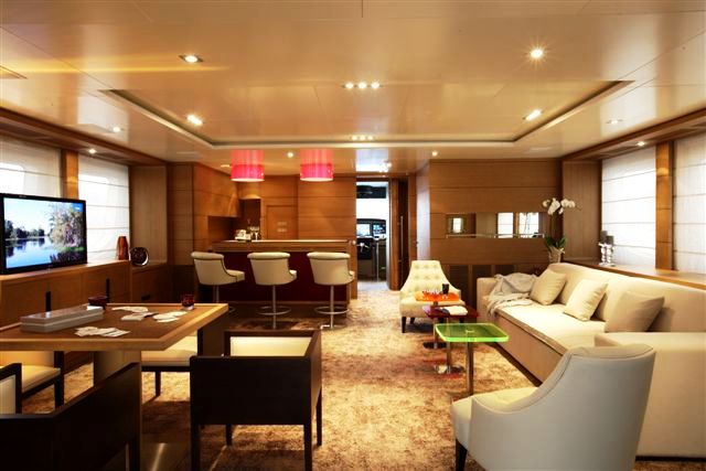 M/Y OCEAN_DREAM is a 36,90m (121’) luxury motor yacht with a beautiful contemporary interior designed by Zuretti. Her tasteful fittings have been chosen carefully with splashes of pinkish red in the main salon, occasional chairs and throw pillows as well as the aft deck seating covers. The general feeling of the interior is elegant yet stylish and chic. Motor yacht OCEAN DREAM’s adjoining dining area is just forward of the salon.
