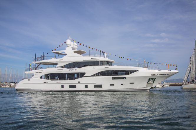 BIG FIVE measures 35.5m (116ft) and features a fibreglass and carbon fibre superstructure. She was designed by Giorgio M Cassetta, who created the entire Mediterraneo 116 series for Benetti. Her interiors created by Achille Salvagni is stylish and modern with soft tones of matt-finish woods in combination with grey and dark shades of ashwood and opulent marbles. She can accommodate 12 guests across 6 cabins, which include a full-beam master suite on the main deck, two VIP double cabins, one guest cabin with two single beds and one guest cabin with a single and a sliding bed. In addition, all cabins are equipped with a Pullman bed, providing more space for accommodating guests overnight. The indoor and outdoor living spaces are spread across the main deck, upper deck and sundeck. There are several spots for dining, entertainment and sunbathing, which makes BIG FIVE a fantastic yacht for holidays in the Mediterranean this summer. She is fitted with two MAN 12-1400 engines which allow a maximum speed of 15 knots and a cruising speed of 10 knots.