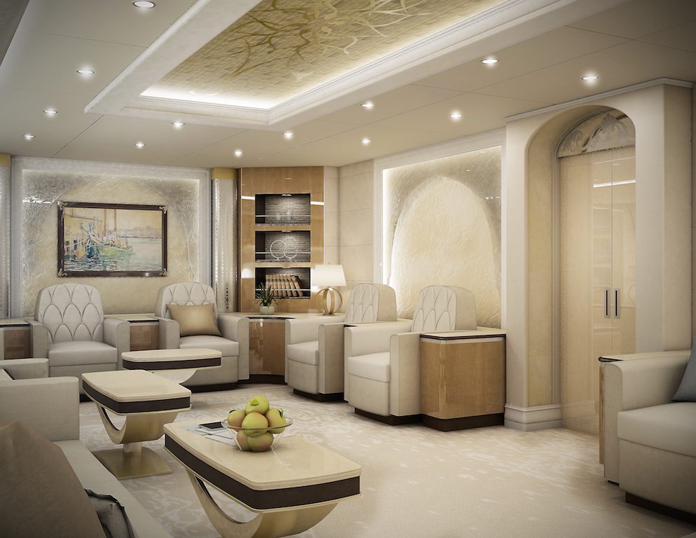 Please contact CharterWorld - the luxury yacht charter specialist - for more on superyacht news item "Greenpoint Boeing 747-8 Private Luxury Jet - Lounge Aft - Image credit to Greenpoint Technologies".