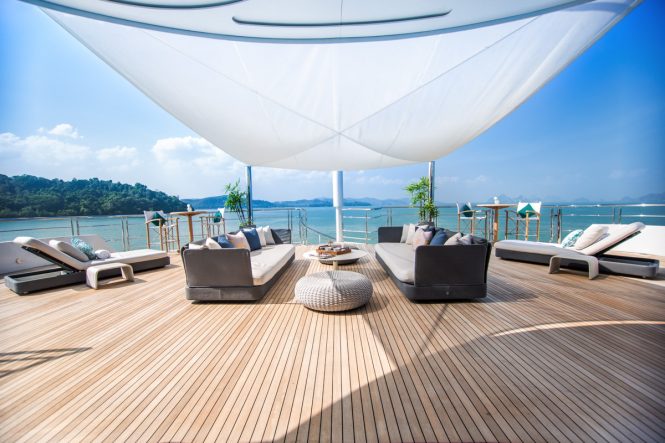 M/Y SALUZI has 4 magnificent exterior decks to choose from, with something for every charter guest aboard. The first 3 levels from the main deck, to the upper deck and bridge deck all offer an abundance of seating, partial shade and access to both the interior and a spiral staircase on the exterior. The sundeck is the social hub, complete with an outdoor cinema, 2 Jacuzzi’s, sunpads, wet bar and lose tables and chairs.