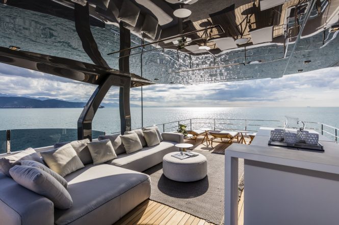 The outdoor areas are just as well equipped with sun loungers, sunpads and a Jacuzzi, and when the helicopter is stored in the hangar the expansive area can be used to host parties.