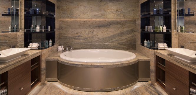 Whether chartering for a casual family holiday or for entertaining visitors, the interiors have a dusky charm that combines neo-classical and contemporary design with classic colour choices of dark wooden panelling and mottled cream fabrics. Deftly placed lighting sets the ambiance after sundown and during the day floor-to-ceiling windows in both the main salon and skylounge produce brightly-lit spaces with excellent views.