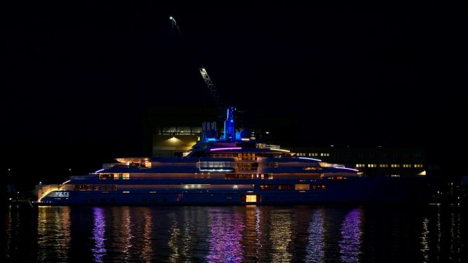 Lurssen mega yacht Project Lightning at night. Photo credit DrDuu