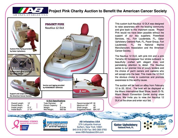AB Inflatables USA has proudly announced that it has sent a check for $20,000 to the American Cancer Society last week, thanks to the auction of its 2014 Nautilus 12 DLX superyacht tender, known as 'Project Pink'. ... read full story
