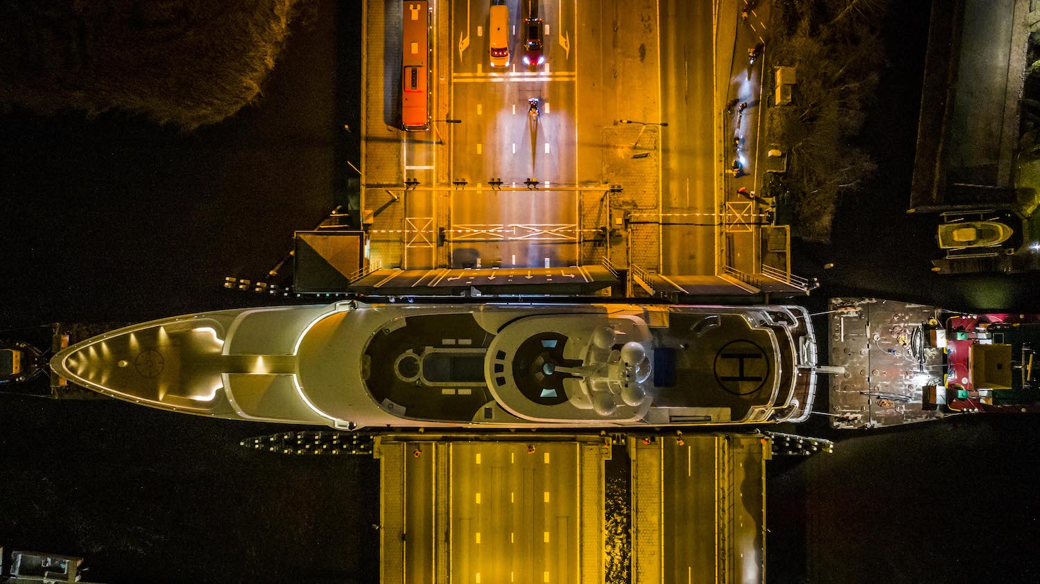 Astonishing photos of 76.5m Feadship superyacht BROADWALK passing through a lifting bridge on her way to sea trials in the North Sea. ... read full story