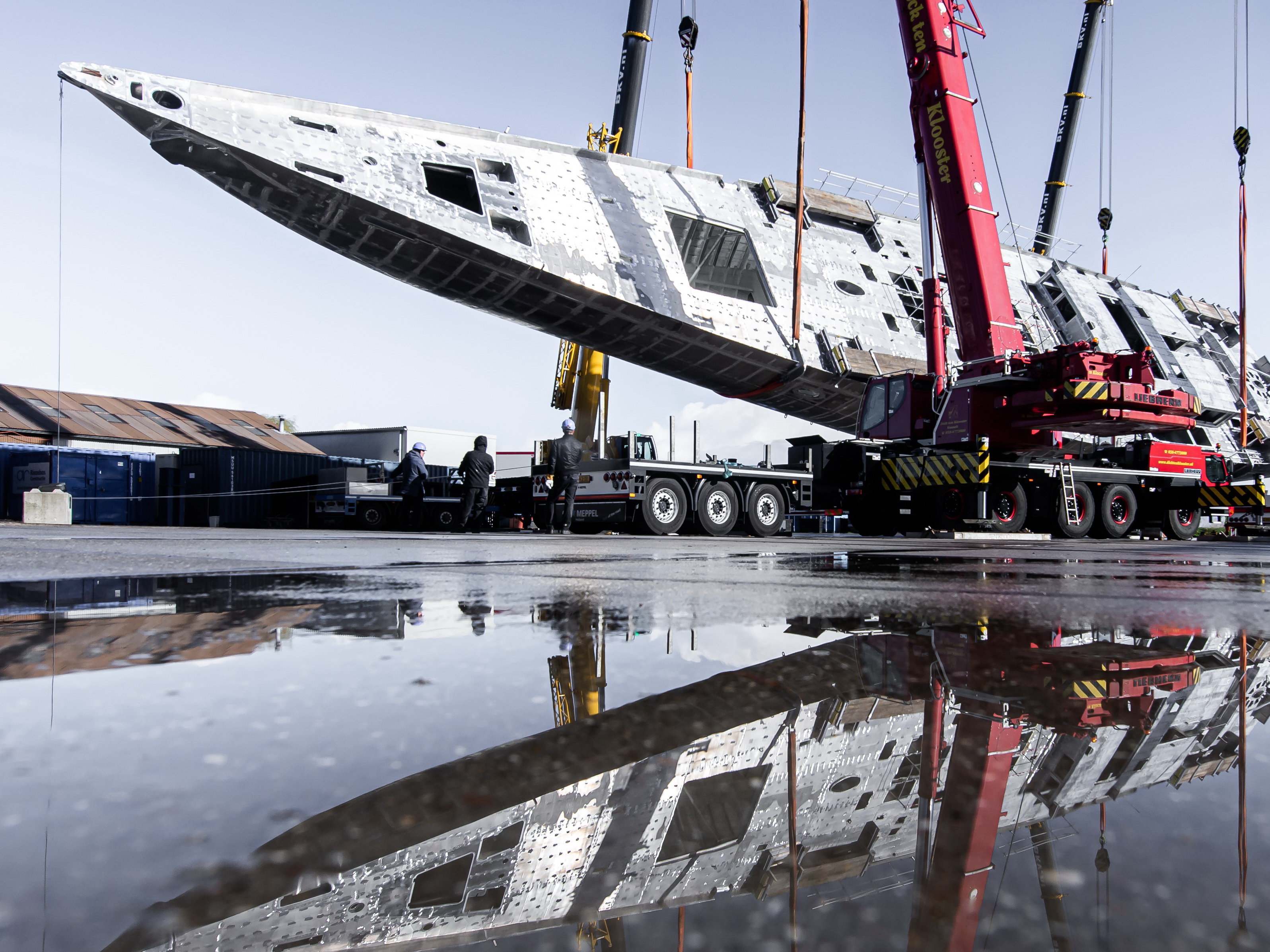 65m Sailing yacht AQUARIUS II (Royal Huisman Project 408) took another step towards completion as her hull was turned