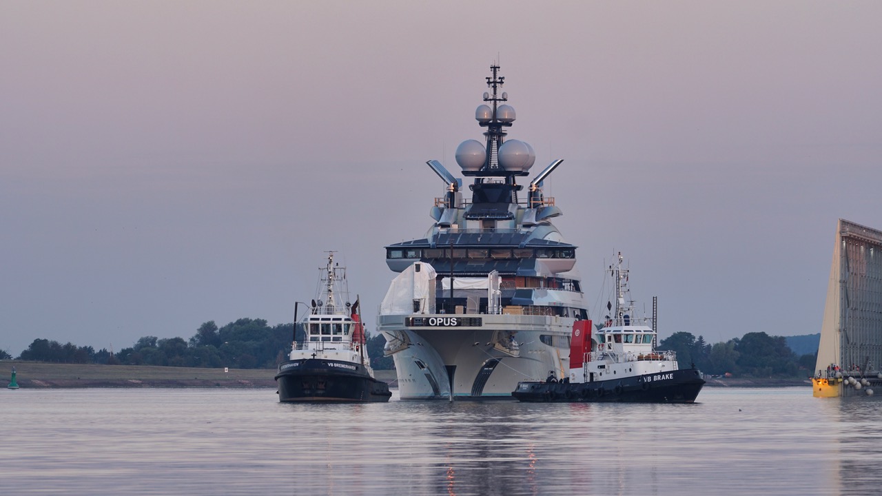 See 142-metre mega yacht OPUS being manoeuvred into the floating dock at the Lürssen facilities. ... read full story