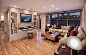 The yacht’s luxury saloon and dining area for eight guests is on the main deck. Meals can be served directly to the interior or exterior servery bars fwd and aft of the galley. A Teppanyaki bar is located on the fly bridge. Aft on the bridge deck is a full sized gymnasium and cinema.