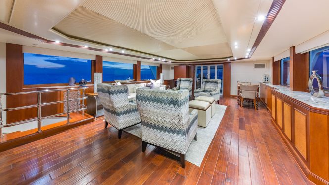 Both the main deck and skylounge offer plush social settings combining contemporary styling with classic touches in the wooden-panelled surroundings. Broad windows span both lengths of the port and starboard sides, so that guests can take in the gorgeous white-sand beaches and azure blue waters from the main salon bar or the sumptuous skylounge armchairs.