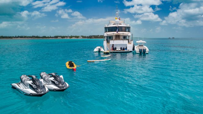 The accommodation sleeps a maximum of 10 guests over 5 beautiful en-suite cabins: 1 Master suite, 2 double cabins and 2 twin cabins. The crew of 8 will take care of every detail, so you and your group can spend time in paradise without a care in the world.