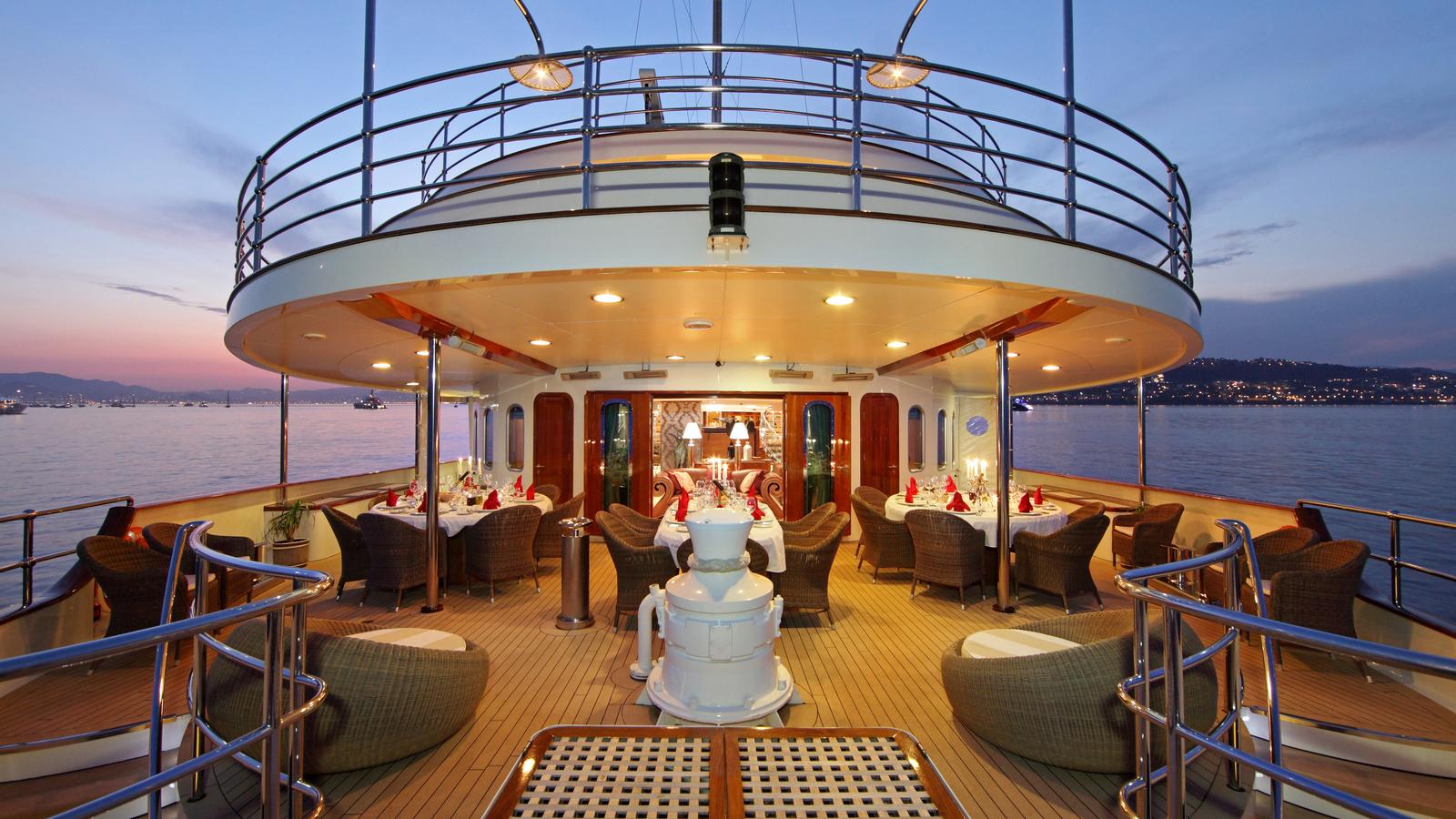 Please contact CharterWorld - the luxury yacht charter specialist - for more on superyacht news item "Outdoor dining and seating area after sunset".
