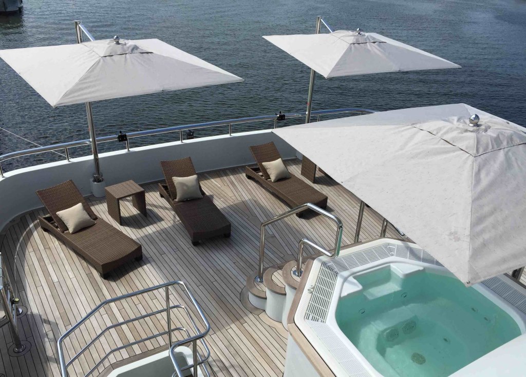 Please contact CharterWorld - the luxury yacht charter specialist - for more on superyacht news item "Jacuzzi and sun loungers on JADE 959 sundeck - Exterior by Espinosa Yacht Design".