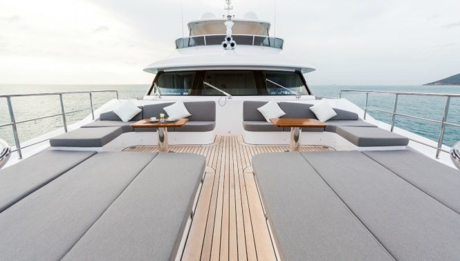 On the bow, the Portuguese deck has a sofa and tables for a quiet meal taking in uninterrupted views, then after guests can stretch out on the sunpads for a rest in the clean summer air.