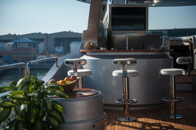 The warm and welcoming main salon is an elegant environment just as suited to hosting a glamorous evening affair as a place to rest and dine during the day. Wooden panelling works seamlessly with the furniture and the cream fabrics, complemented by matte and gloss textures on the decorations throughout. The spacious aft living area is designed for family living and the adjacent bar has an excellent selection for refreshing after hours in the sun or to accompany a special occasion with a meal at the formal dining area.
