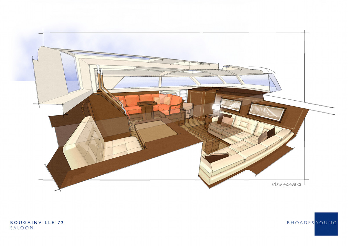 Interior of Bougainville yacht designed by Rhoades Young – Saloon Forward View