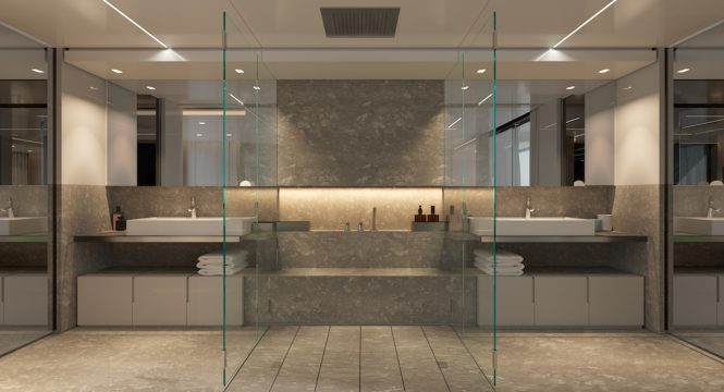 The main deck amidships to starboard has a wine cellar that acts as a divider between the shared living spaces and the Owners’ stateroom, where there is a glass sliding door out onto a fixed side balcony, which ensures that the occupants can use the space without the help of the crew.