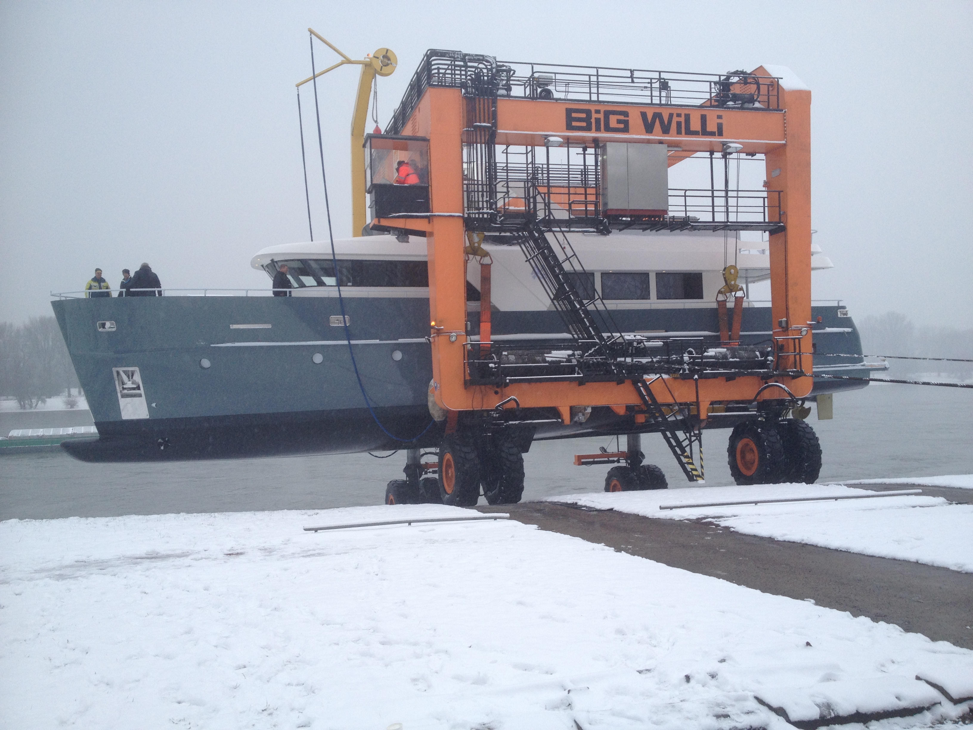 The travellift moves sideways out of the river and loads to a road transporter for the final part of the journey into the Dusseldorf Boat Show